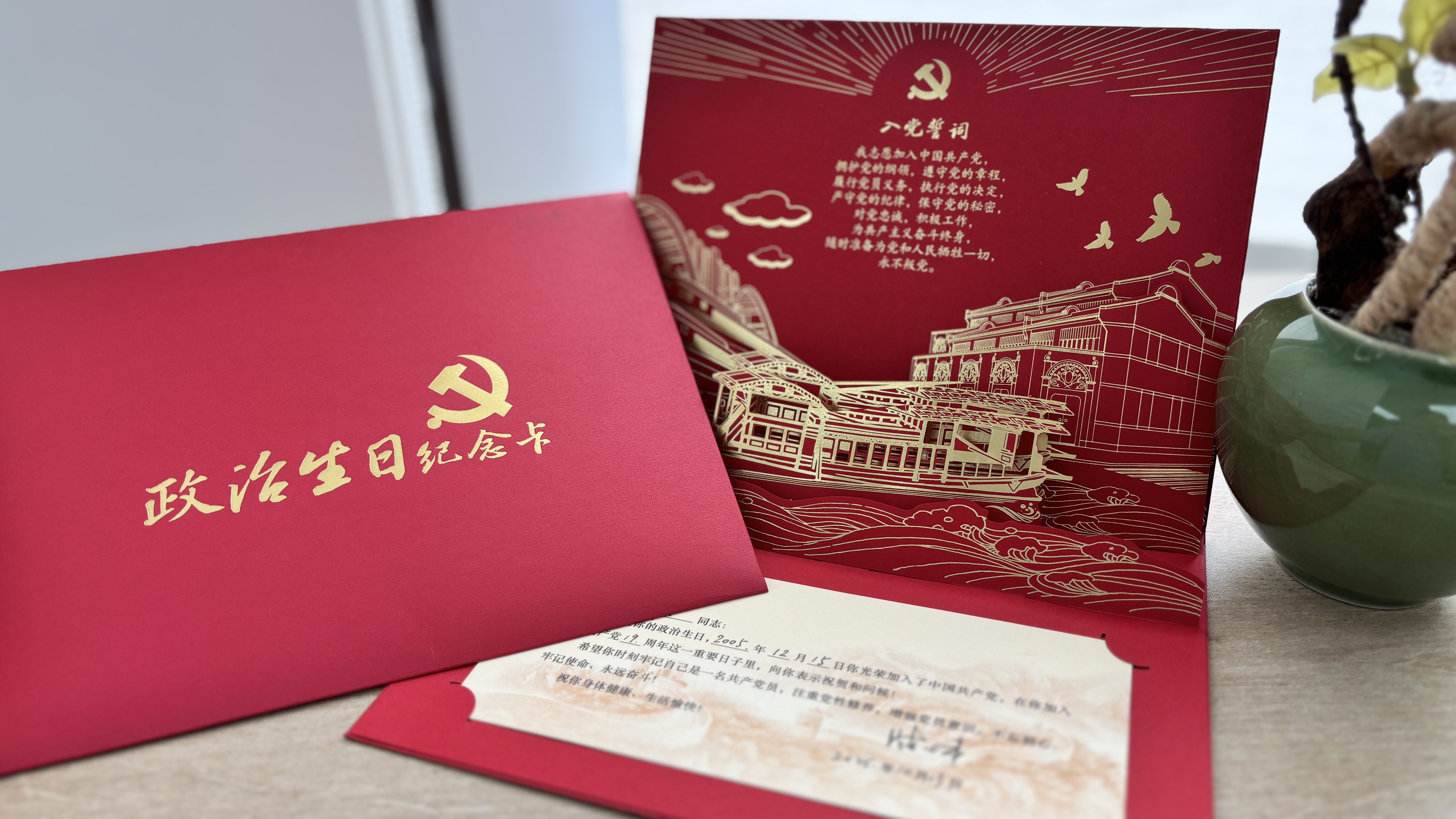 一份纪念礼物,传递组织关怀。活动最后,党支部书记为党员逐一发放政治生日纪念品。这份心意寄托着组织的关心与对党员践行宗旨的殷切期望。印有誓词的贺卡唤醒初心,镌刻的入党时间串联起与党同行的岁月,时刻提醒我们,无论行至何方、岗位如何更迭,党员政治本色亦当矢志坚守。