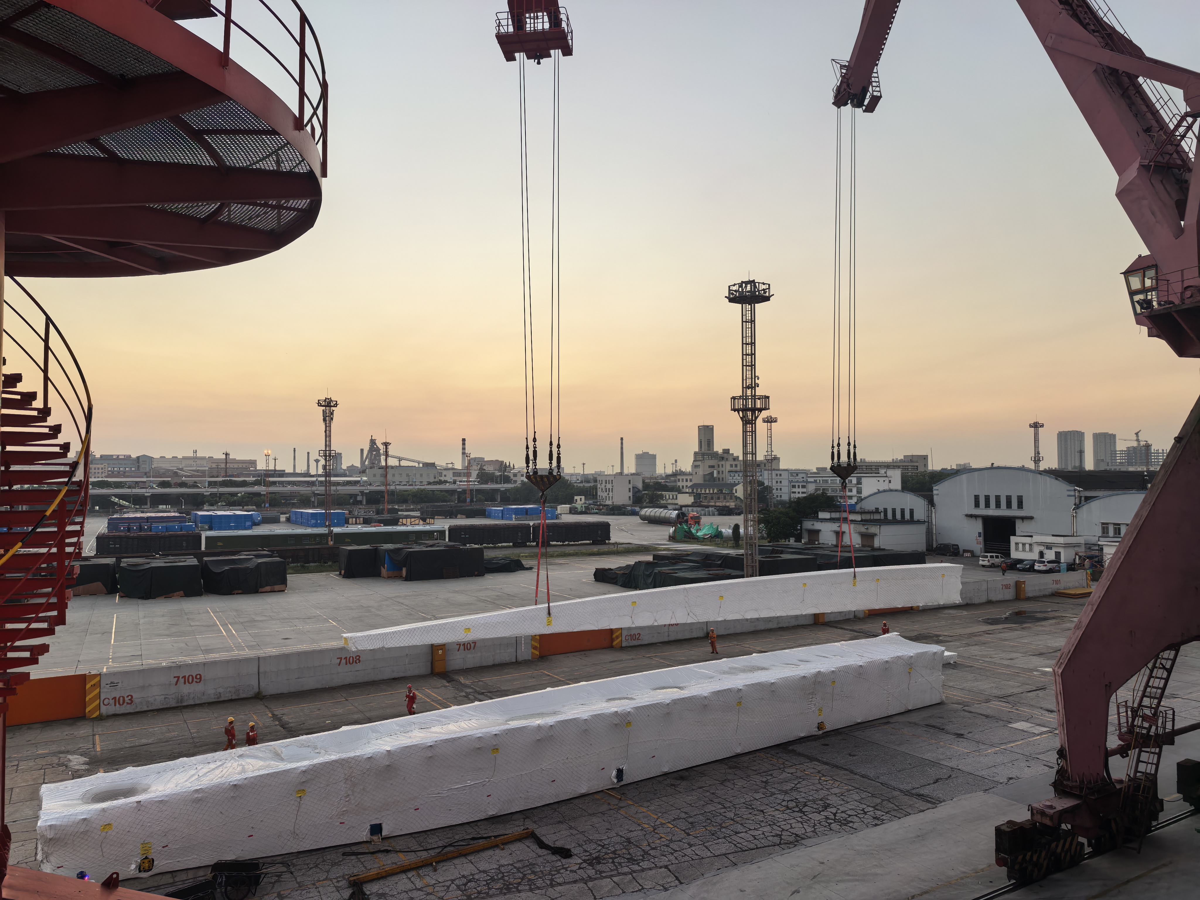 在这场高难度作业中,各岗位人员以“分工明确、协同无间”的专业姿态,勾勒出一幅高效作业的实景图:指挥员全程紧盯作业流程,凭借丰富经验实时调度,确保起吊、转位、落舱等各环节无缝衔接,为作业效率筑牢“指挥中枢”;门机司机聚精会神操控设备,每一次起吊、每一次转向都精准平稳,以过硬技术保障超限件在吊装过程中的万无一失;安全员往返巡查作业区域,细致排查安全隐患、人员操作规范,用“眼到、脚到、心到”的严谨态度筑牢安全生产“防护网”,为超限件安全起吊打下坚实基础。随着超限件平稳落位于舱内,这场紧张的“攻坚战”也迎来圆满收官。