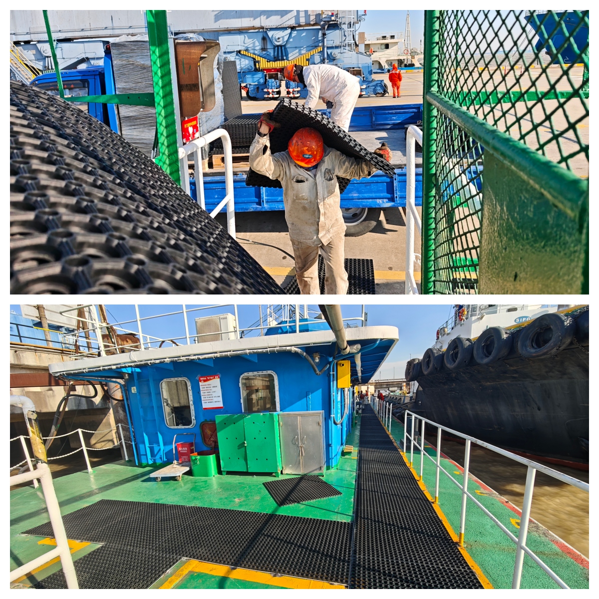 作为试点项目,外四基地改造取得显著成效。在拖轮与码头连接的甲板等关键区域铺设的新型高性能防滑垫,具备优异耐磨防滑性能,从根本上预防雨雪天气滑倒风险。同时,创新改制的埋入式地令消除了凸出部件绊倒隐患,体现了公司精细化、人性化的安全管理,得到船员的一致好评。