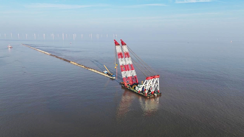 项目直面外海,受季风与寒潮影响显著,且处于强潮流海域,施工直面多重挑战,安装需精准避开强潮流时段,作业窗口有限,对气象水文条件要求极高。为此,指挥部带领项目团队成立科技攻关小组,将实验室“搬”到船上,联合专业科研单位开展海流监测,编制潮差数据分析表,有效拓展了可作业时间,单桶安装时间从48小时缩短至36小时。与此同时,智能化施工成为突破瓶颈的关键举措:指挥部组织施工单位聚焦核心技术自主研发,经5代气浮平台迭代优化,形成新一代桶式基础结构沉贯系统,实现了从人工操纵到自动化沉贯的升级;引入无人机摄影测量技术,对已安装区域进行变形监测,并通过自动化系统发现问题、人工及时干预,为工程质量与安全控制提供了可靠数据支撑。