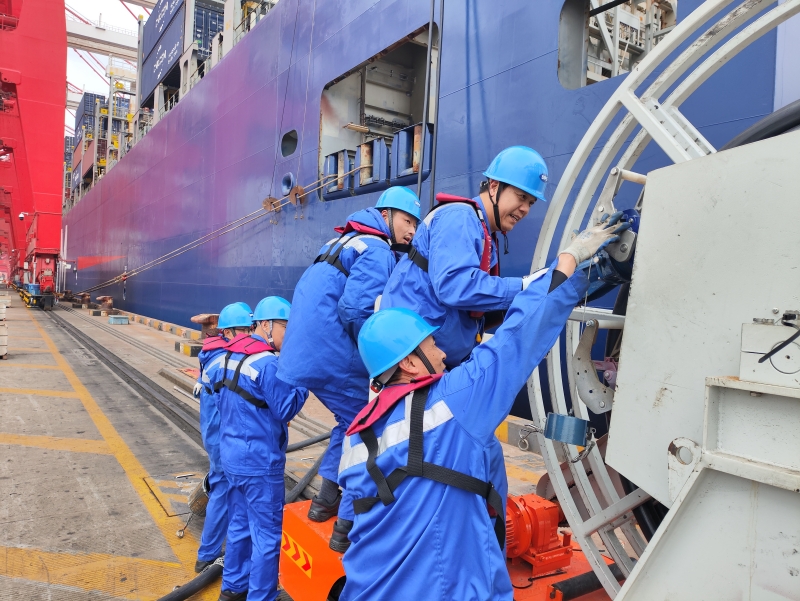 多措深化服务,保障供电稳定运行。为确保供电安全、高效、有序,公司采取了一系列有力措施。优化内部工作流程,组织召开岸电工作专题会,编制、完善岸电使用管理办法与供电流程,实行“计划制定、节点对接、资源协调、计划落实”的一体化运作模式。加强多方沟通协调,积极与行业主管部门、业务相关单位及船方沟通,争取让船舶停靠到最佳位置,缩短电缆拖拽距离,提升连船效率。提前做好接电准备,工作人员及相关设备提前到位,并在接电前与船方充分沟通,所有连船操作均严格执行安全规程。强化供电过程巡检,执行每2小时一次的定检;针对涨落潮、突风、高温等特殊工况,增加巡检频次,及时调整供电方案,确保系统稳定运行。
