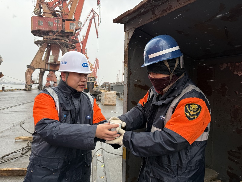 体现组织关怀,落实员工健康保护。公司高度重视寒潮期间员工的身心健康与作业安全。工前加强对重点人员身体状况的排摸,确保不带病上岗。对首次在码头过冬的新员工进行重点指导与关注;科学合理安排劳动力,对长时间处于风口等艰苦的岗位人员进行适当轮换调剂,并及时将御寒物资配发到一线员工手中。
