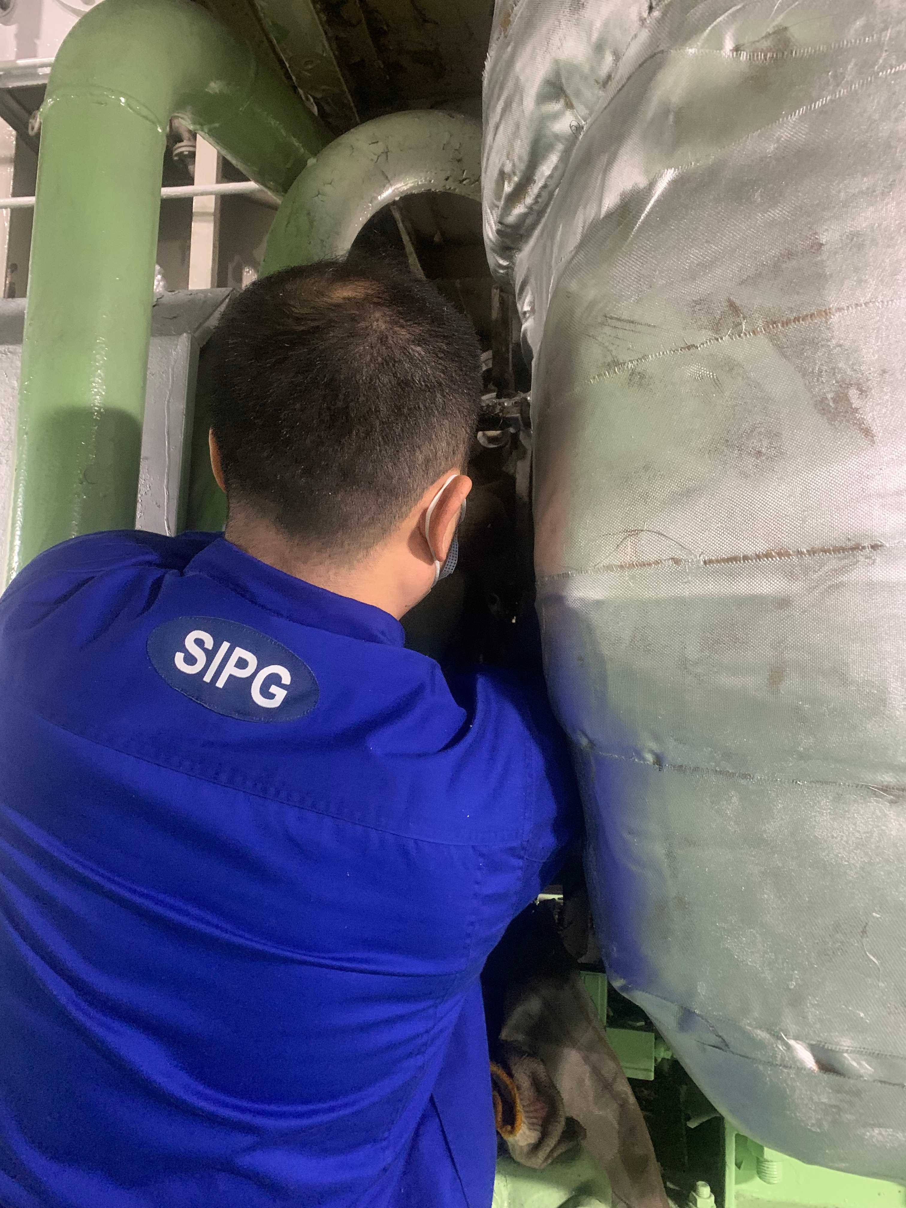 险情就是命令,正在休息的大管轮接到通知后,立即冲入机舱,带领团队展开排查,并迅速锁定故障点,若不及时修复,将引发一系列连锁反应,严重影响生产安全。面对复杂局面,大管轮一边严格按照流程上报公司,一边组织机舱人员启动抢修预案。机舱里高温难耐,操作空间狭小,机舱人员秉承“新时代上海港洋山精神”,经过深夜数小时的连续奋战,顺利完成新垫床的安装。经测试,运行参数正常,故障消除。
