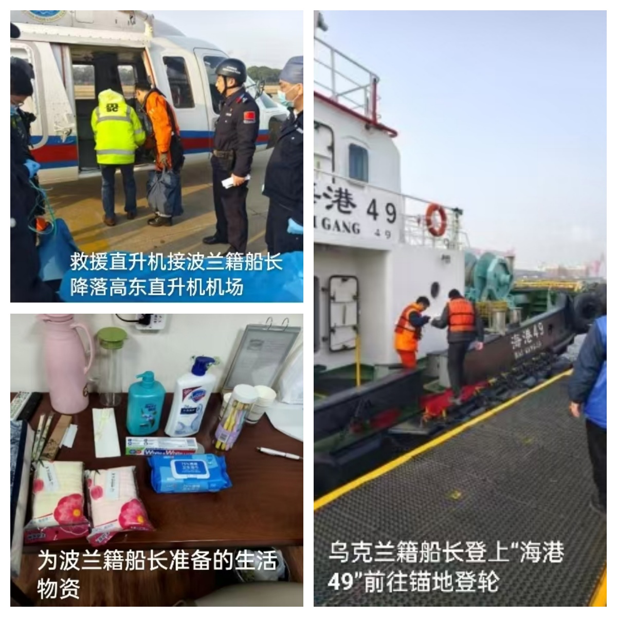 救援行动紧张进行的同时,为确保船舶的正常航行与运营,公司同步受理了船公司指派乌克兰籍新任船长接替的申请。面对复杂的联检手续与海上交通安排,上港联代展现卓越的协调能力,周密部署,积极与拖轮公司、海关、边检及码头单位进行高效沟通。经过紧锣密鼓的筹备,2月2日15时30分,新任乌克兰籍船长顺利搭乘“海港49”拖轮,安全抵达锚地并成功登上原班轮,实现了船员的平稳、安全交接,保障了船舶后续航程。