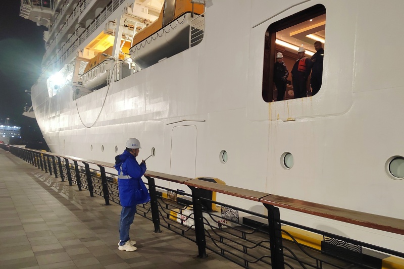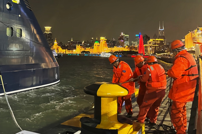 3月11日的夜晚,“璐明娜”号邮轮缓缓靠泊。系解缆工人们正在船舷与码头之间紧张作业,身后,是灯光璀璨的外滩夜景。