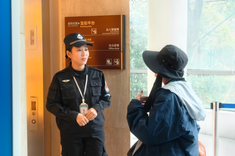 一位客运员正用英语与下船的外籍旅客沟通,提示正确通行路线。近年,客货运业务部持续提升旅客服务满意度,其中的英语培训让越来越多一线员工敢于开口、主动同旅客交流。