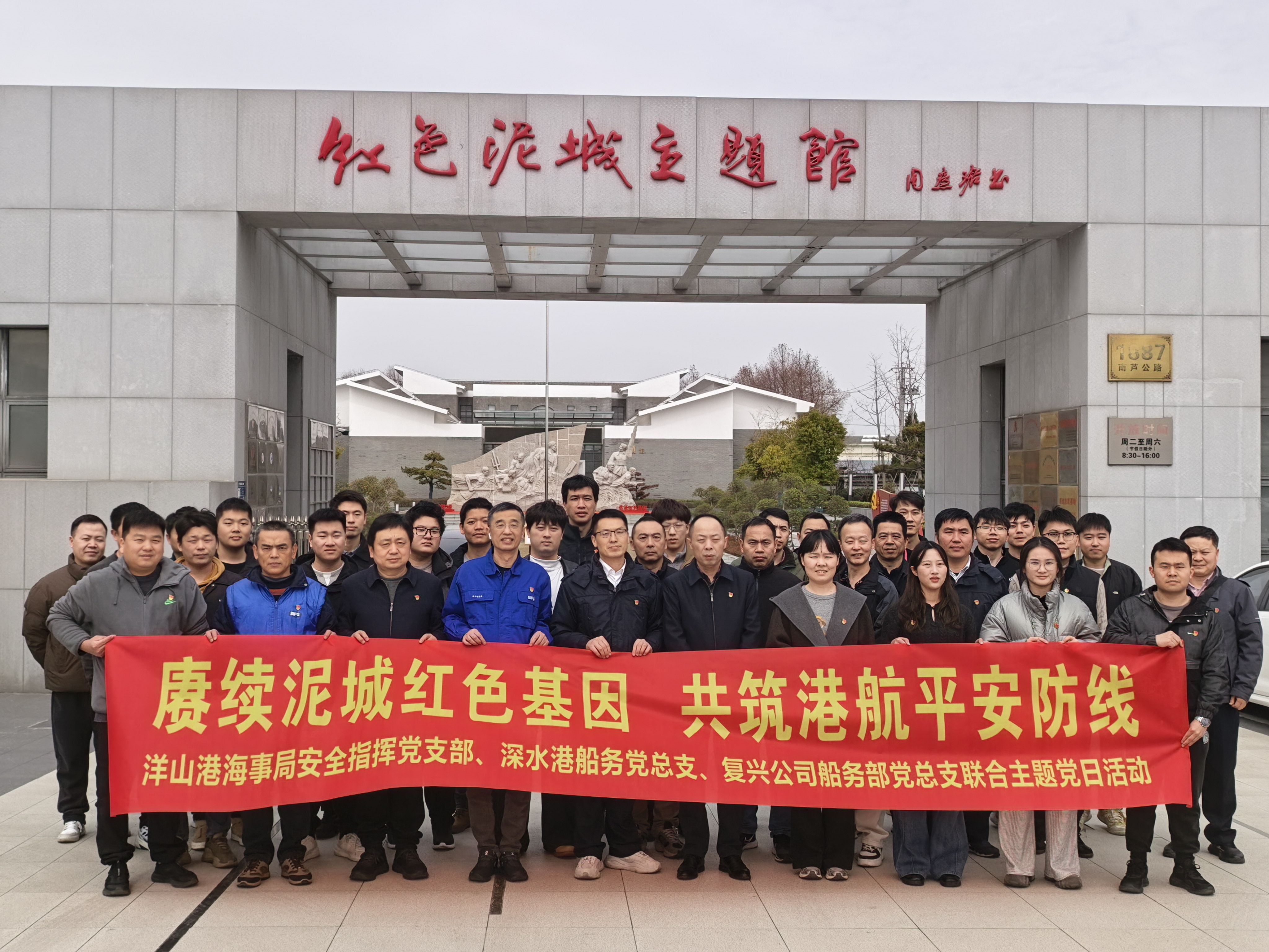 为深入学习贯彻红色精神,深化党建引领,凝聚青年力量,3月20日,复兴公司船务部党总支与深水港船务党总支、洋山港海事局安全指挥党支部联合开展“赓续泥城红色基因,共筑港航平安防线”主题党日活动。本次活动同步组织团员青年共同参与,实现党建带团建、党团共进步。
