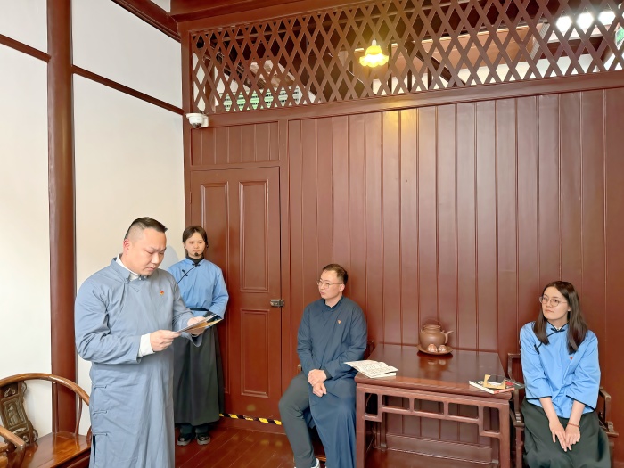 创新学习形式,增强教育实效。本次党课采用沉浸式情景互动形式,3位党员代表身着历史服装,声情并茂地朗读了《毛泽东和失去的亲人们》节选,再现了革命年代共产党人舍身忘我、以身许党的感人历史。朗读结束后,代表深情诵读毛泽东词作《蝶恋花·答李淑一》,以诗词为媒,将革命先辈的精神力量直抵人心。现场气氛庄重热烈,党员干部深受触动、感悟深刻。