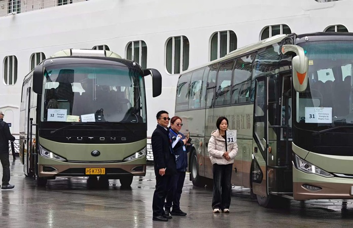 ▲“七海探险家”号邮轮靠泊后,地接旅行社正整装待发,迎接即将到来的国际旅客。