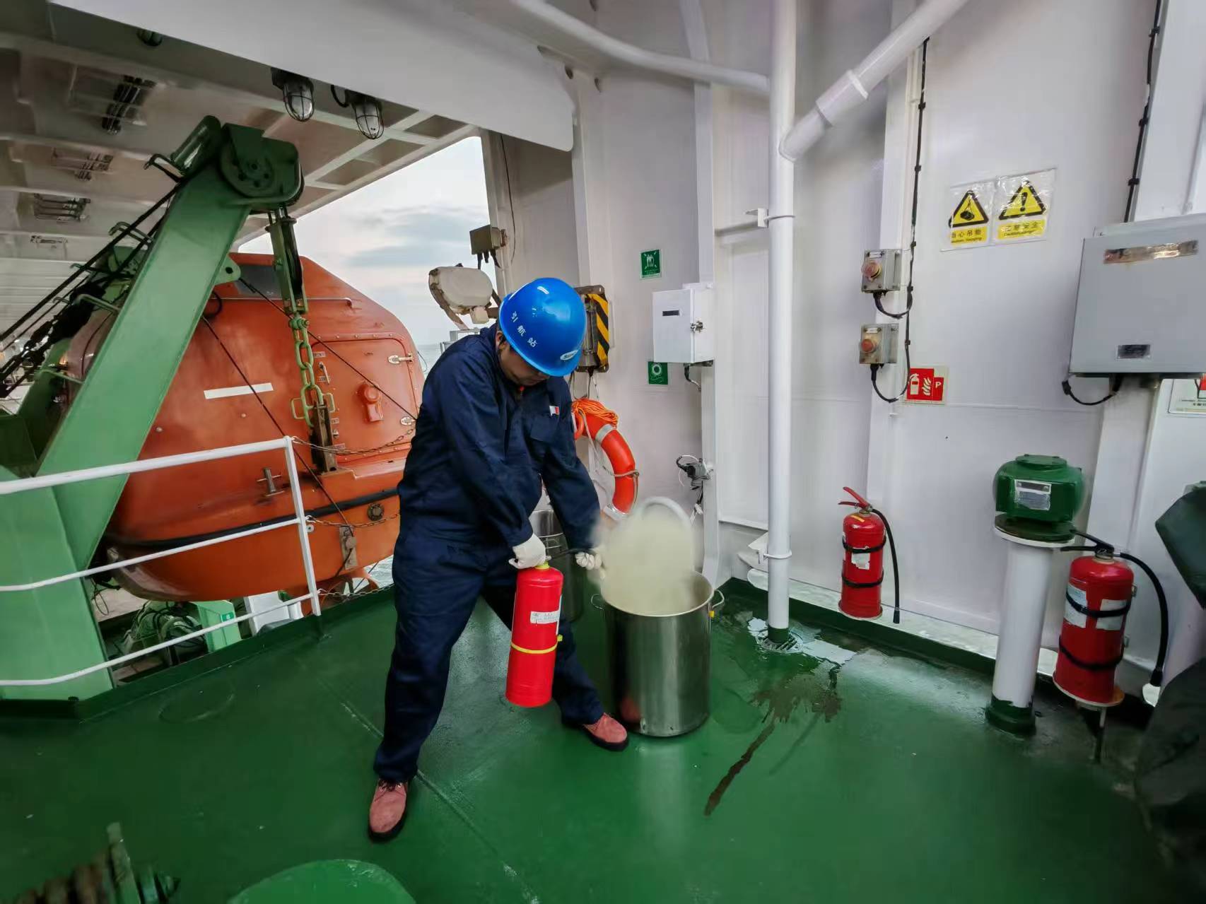 急促的消防警报划破沪港引6轮的宁静,恰逢119全国消防日,一场以“甲板电瓶间着火”为模拟场景的消防演练在船上正式拉开序幕。