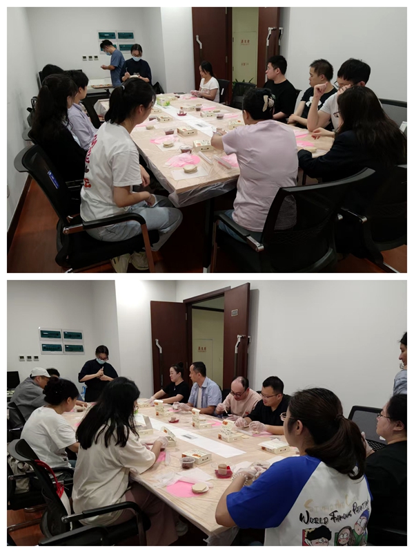 职工们相互配合、分工协作。有的揉面擀皮,有的调配肉馅,有的学习捏制花纹,现场笑声不断。初次尝试的年轻职工笑着说:“以前只吃过鲜肉月饼,今天亲手做才知道里面有这么多门道,和同事一起合作特别开心。” 经验丰富的老职工则主动分享技巧,帮身边同事调整月饼形状。经过 1 个多小时的制作,一盘盘月饼送入烤箱。待月饼出炉,金黄的外皮散发着阵阵香气,职工们捧着自己的劳动成果,纷纷拍照留念。