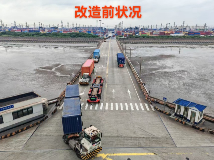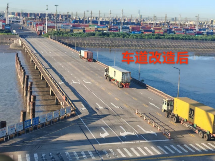 在试点成功的基础上,班组进一步组织研讨,确定了新的优化方案:将原为双向四车道的1号、2号、3号引桥各增加一条固定上行车道,形成上行三车道、下行双车道,同时将原为双向六车道的4号引桥中的一条下行道改为潮汐车道。随后,公司工程技术部与生产操作部紧密配合,见缝插针地在一个月内完成了引桥车道的优化工作。改造完成后,10月运行数据显示,集卡平均周转率为24.06分钟/车次,较优化前提升6%,有效解决了因车道配置不足导致的通行瓶颈问题,为码头安全生产和作业效率提升提供了有力保障。