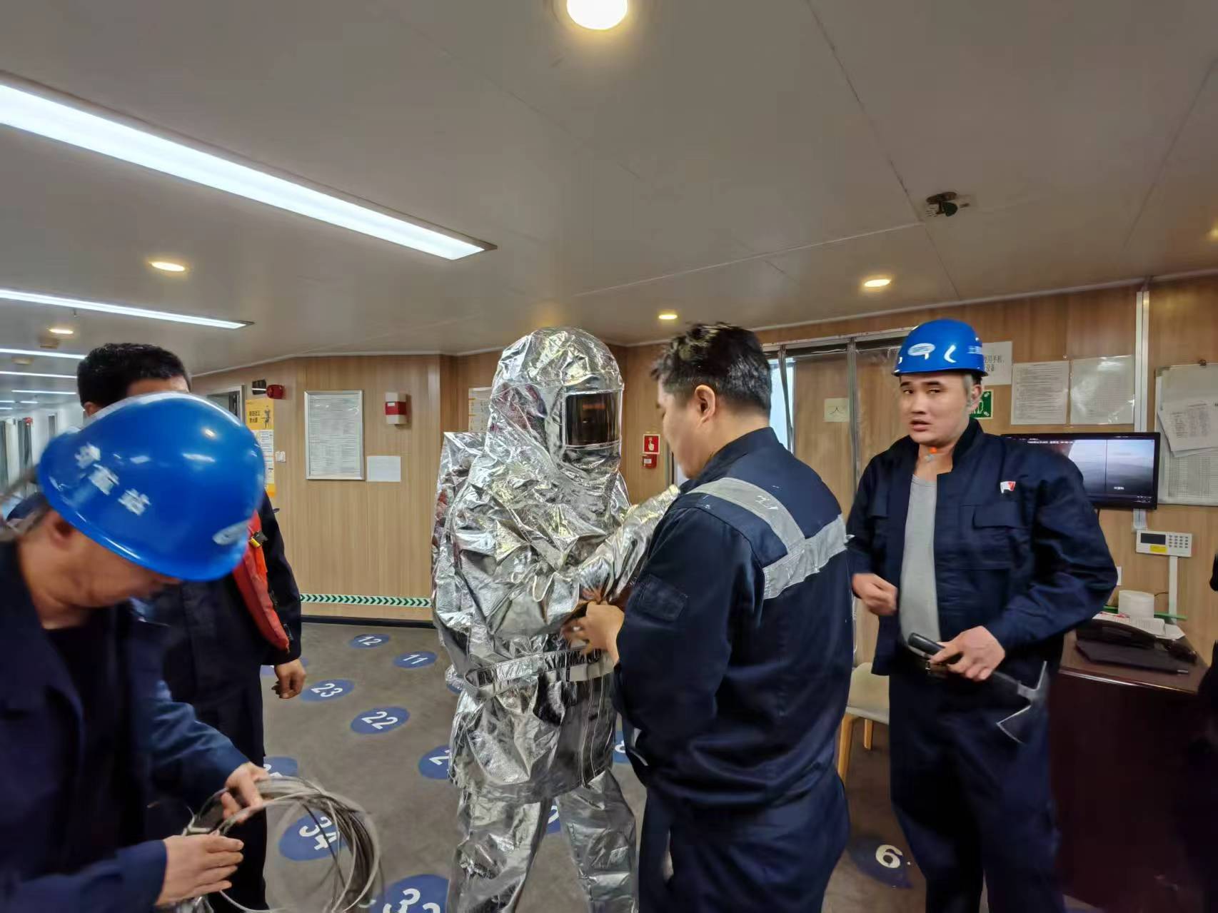 按照消防部署表就位:甲板部、机舱部立即组建探火小组,其余人员做好警戒,持灭火器材,消防水以出水。没有慌乱的奔跑,没有无序的喧哗。船员们依据消防部署表部署方案,各司其职,快速到位,从警报触发到全员集结,整个过程紧凑高效,尽显专业素养。