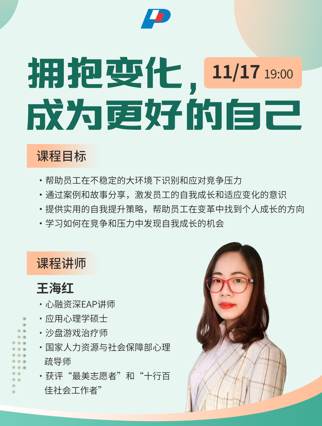 近日,为帮助职工更好地应对当前复杂多变的外部环境,缓解工作与竞争压力,提升心理适应能力,引航站工会组织全体职工在线参加了以“拥抱变化,成为更好的自己”为主题的心理健康专题讲座。课程由心融资深EAP讲师、应用心理学硕士王海红老师主讲,反响热烈。