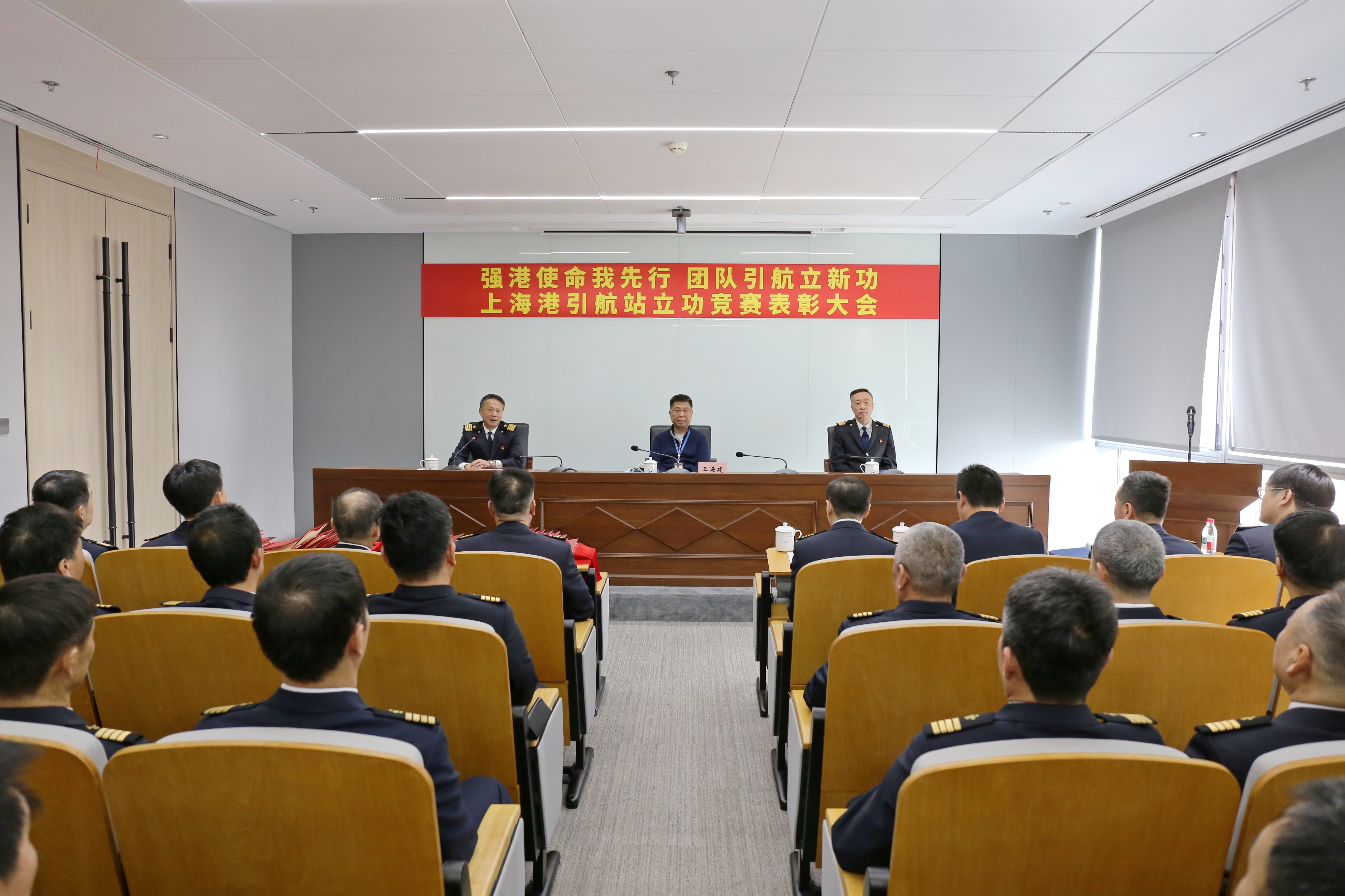3月20日,引航站隆重召开“强港使命我先行,团队引航立新功”立功竞赛表彰大会,集团副总裁王海建莅临大会并授奖,站领导班子、立功竞赛受嘉奖的引航员代表、各职能科室负责人等70余人参加大会。